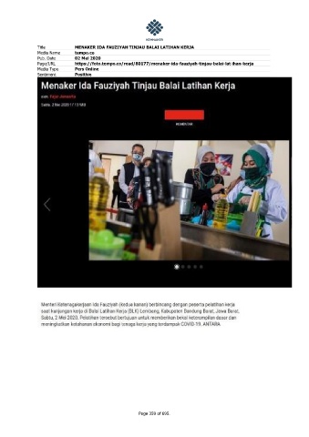 Title MENAKER IDA FAUZIYAH TINJAU BALAI LATIHAN KERJA Media Name tempo.co Pub. Date 02 Mei 2020 Page/URL https://foto.tempo.co/read/80177/menaker-ida-fauziyah-tinjau-balai-lat ihan-kerja Media Type Pers Online Sentiment Positive Page 359 of 695.