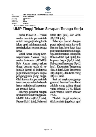 Title UMP TINGGI TEKAN SERAPAN TENAGA KERJA Media Name Bisnis Indonesia Pub. Date 29 Juli 2019 Page/URL 22 Media Type Koran Sentiment Positive Page 6 of 131.