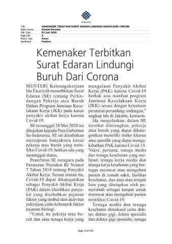 Title KEMENAKER TERBITKAN SURAT EDARAN LINDUNGI BURUH DARI CORONA Media Name Rakyat Merdeka Pub. Date 02 Juni 2020 Page/URL 6 Media Type Koran Sentiment Positive Page 19 of 197.