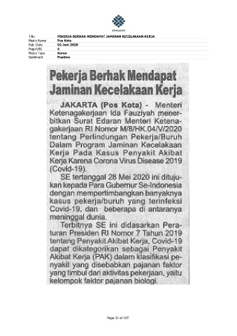 Title PEKERJA BERHAK MENDAPAT JAMINAN KECELAKAAN KERJA Media Name Pos Kota Pub. Date 02 Juni 2020 Page/URL 6 Media Type Koran Sentiment Positive Page 32 of 197.