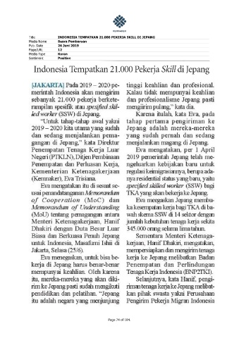 Title INDONESIA TEMPATKAN 21.000 PEKERJA SKILL DI JEPANG Media Name Suara Pembaruan Pub. Date 26 Juni 2019 Page/URL 12 Media Type Koran Sentiment Positive Page 74 of 104.
