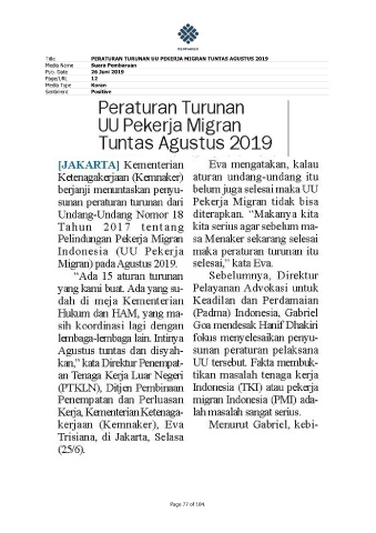 Title PERATURAN TURUNAN UU PEKERJA MIGRAN TUNTAS AGUSTUS 2019 Media Name Suara Pembaruan Pub. Date 26 Juni 2019 Page/URL 12 Media Type Koran Sentiment Positive Page 77 of 104.