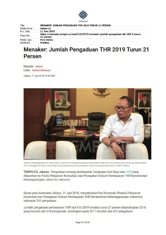 Title MENAKER: JUMLAH PENGADUAN THR 2019 TURUN 21 PERSEN