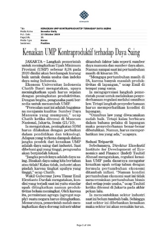 Title KENAIKAN UMP KONTRAPRODUKTIF TERHADAP DAYA SAING Media Name Investor Daily Pub. Date 22 Oktober 2019 Page/URL 21 Media Type Koran Sentiment Positive Page 5 of 104.