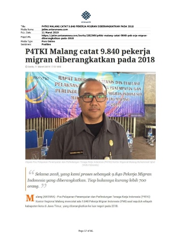 Title P4TKI MALANG CATAT 9.840 PEKERJA MIGRAN DIBERANGKATKAN PADA 2018