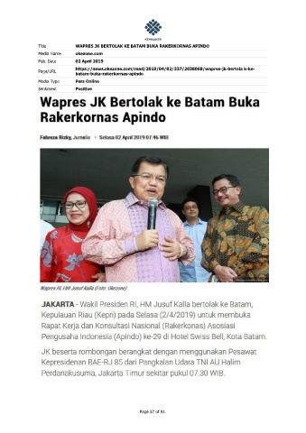Title WAPRES JK BERTOLAK KE BATAM BUKA RAKERKORNAS APINDO