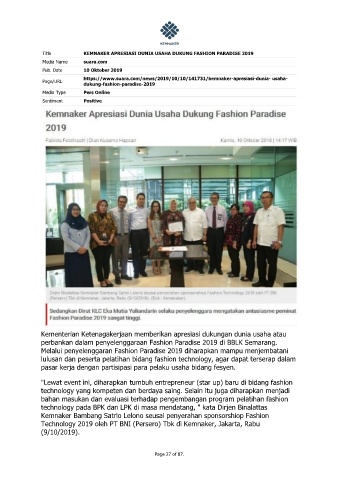 Title KEMNAKER APRESIASI DUNIA USAHA DUKUNG FASHION PARADISE 2019