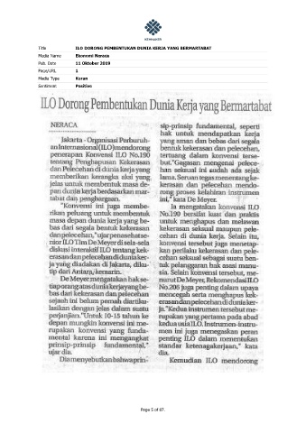 Title ILO DORONG PEMBENTUKAN DUNIA KERJA YANG BERMARTABAT Media Name Ekonomi Neraca Pub. Date 11 Oktober 2019 Page/URL 1 Media Type Koran Sentiment Positive Page 5 of 87.