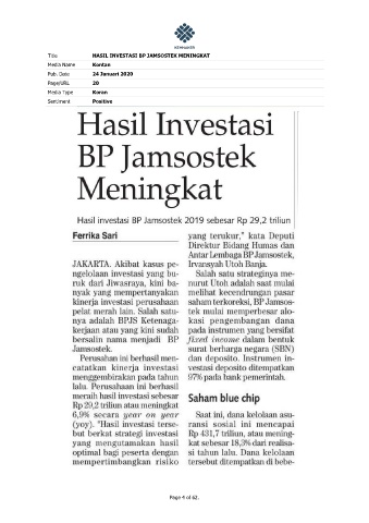 Title HASIL INVESTASI BP JAMSOSTEK MENINGKAT Media Name Kontan Pub. Date 24 Januari 2020 Page/URL 20 Media Type Koran Sentiment Positive Page 4 of 62.