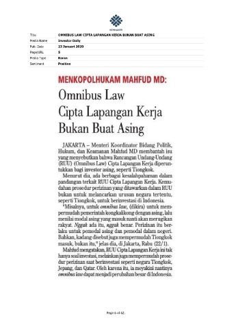 Title OMNIBUS LAW CIPTA LAPANGAN KERJA BUKAN BUAT ASING Media Name Investor Daily Pub. Date 23 Januari 2020 Page/URL 5 Media Type Koran Sentiment Positive Page 6 of 62.