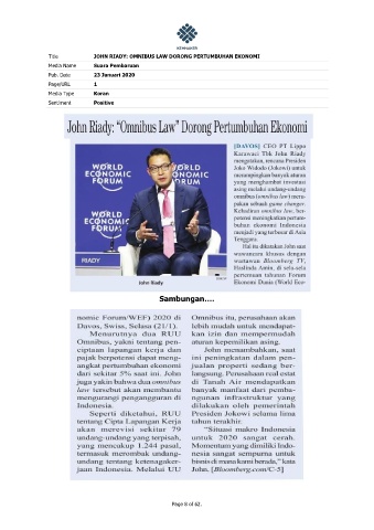 Title JOHN RIADY: OMNIBUS LAW DORONG PERTUMBUHAN EKONOMI Media Name Suara Pembaruan Pub. Date 23 Januari 2020 Page/URL 1 Media Type Koran Sentiment Positive Sambungan…. Page 8 of 62.