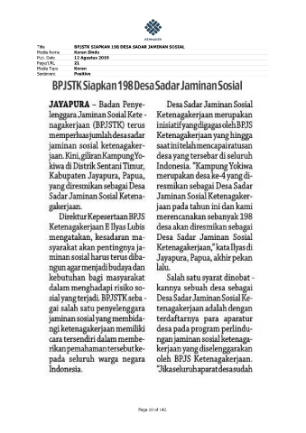 Title BPJSTK SIAPKAN 198 DESA SADAR JAMINAN SOSIAL Media Name Koran Sindo Pub. Date 12 Agustus 2019 Page/URL 21 Media Type Koran Sentiment Positive Page 10 of 142.