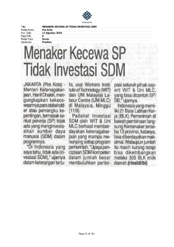 Title MENAKER KECEWA SP TIDAK INVESTASI SDM Media Name Pos Kota Pub. Date 12 Agustus 2019 Page/URL 6 Media Type Koran Sentiment Positive Page 22 of 142.