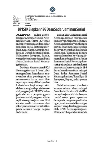 Title BPJSTK SIAPKAN 198 DESA SADAR JAMINAN SOSIAL OK Media Name Koran Sindo Pub. Date 12 Agustus 2019 Page/URL 12 Media Type Koran Sentiment Positive Page 23 of 142.