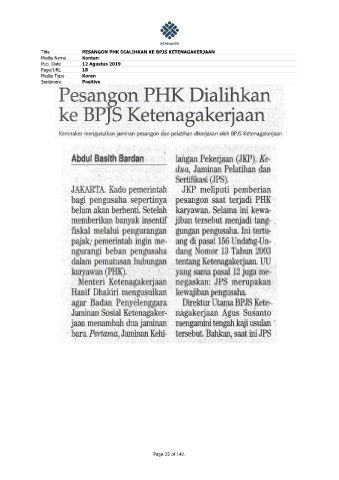 Title PESANGON PHK DIALIHKAN KE BPJS KETENAGAKERJAAN Media Name Kontan Pub. Date 12 Agustus 2019 Page/URL 18 Media Type Koran Sentiment Positive Page 25 of 142.