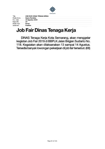 Title JOB FAIR DINAS TENAGA KERJA Media Name Suara Merdeka Pub. Date 10 Agustus 2019 Page/URL 14 Media Type Koran Sentiment Positive Page 52 of 142.