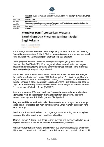 negara. JKP ini semacam unemployment benefit," kata Menaker Hanif Dhakiri saat