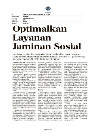 Title OPTIMALKAN LAYANAN JAMINAN SOSIAL Media Name Kompas Pub. Date 12 Agustus 2019 Page/URL 14 Media Type Koran Sentiment Positive Page 7 of 142.
