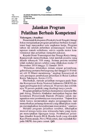 Title JALANKAN PROGRAM PELATIHAN BERBASIS KOMPETENSI Media Name Analisa Daily Pub. Date 12 Februari 2019 Page/URL 22 Media Type Koran Sentiment Positive Page 54 of 75.