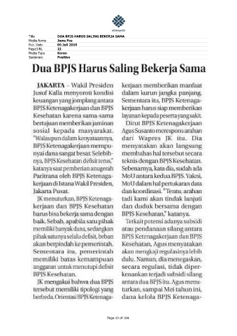 Title DUA BPJS HARUS SALING BEKERJA SAMA Media Name Jawa Pos Pub. Date 05 Juli 2019 Page/URL 21 Media Type Koran Sentiment Positive Page 10 of 104.