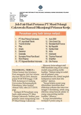 Title JOB FAIR HARI PERTAMA PT MUSI PELANGI CAKRAWALA RAMAI DIKUNJUNGI PELAMAR KERJA Media Name Sriwijaya Post Pub. Date 04 Juli 2019 Page/URL 6 Media Type Koran Sentiment Positive Page 18 of 104.