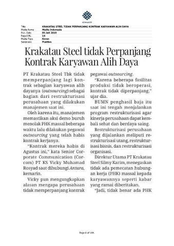 Title KRAKATAU STEEL TIDAK PERPANJANG KONTRAK KARYAWAN ALIH DAYA Media Name Media Indonesia Pub. Date 05 Juli 2019 Page/URL 14 Media Type Koran Sentiment Positive Page 8 of 104.