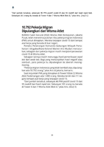 "Dari jumlah tersebut, sebanyak 46 PMI positif covid-19 dan 55 reaktif dari hasil rapid test. Sebanyak 101 orang itu berada di Tower 4 dan 7 Wisma Atlet Blok D," jelas Aris. (Ins/J-1) 19