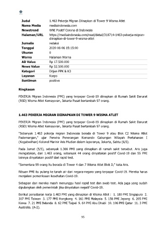 Judul 1.463 Pekerja Migran Diinapkan di Tower 9 Wisma Atlet