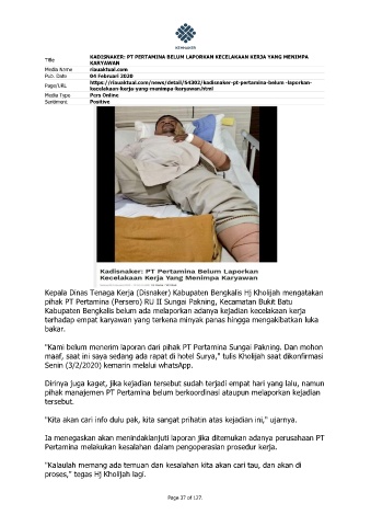 Title KADISNAKER: PT PERTAMINA BELUM LAPORKAN KECELAKAAN KERJA YANG MENIMPA