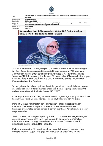 Indonesia (TKI) di Hongkong dan Taiwan. "Kemnaker dan BPJamsostek akan segera