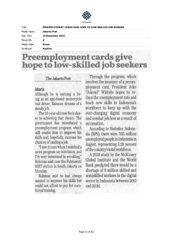 Title PREEMPLOYMENT CARDS GIVE HOPE TO LOW-SKILLED JOB SEEKERS Media Name Jakarta Post Pub. Date 18 Desember 2019 Page/URL 4 Media Type Koran Sentiment Positive Page 10 of 59.