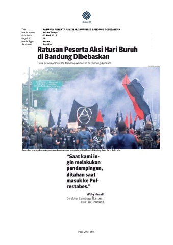 Title RATUSAN PESERTA AKSI HARI BURUH DI BANDUNG DIBEBASKAN Media Name Koran Tempo Pub. Date 03 Mei 2019 Page/URL 16 Media Type Koran Sentiment Positive Page 20 of 169.