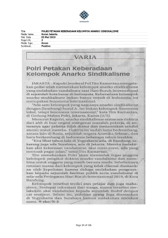 Title POLRI PETAKAN KEBERADAAN KELOMPOK ANARKO SINDIKALISME Media Name Koran Jakarta Pub. Date 03 Mei 2019 Page/URL 2 Media Type Koran Sentiment Positive Page 34 of 169.