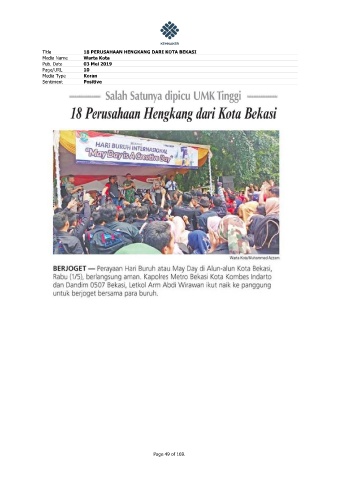 Title 18 PERUSAHAAN HENGKANG DARI KOTA BEKASI Media Name Warta Kota Pub. Date 03 Mei 2019 Page/URL 10 Media Type Koran Sentiment Positive Page 49 of 169.