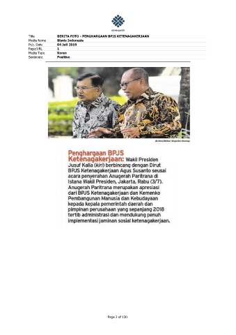 Title BERITA FOTO - PENGHARGAAN BPJS KETENAGAKERJAAN Media Name Bisnis Indonesia Pub. Date 04 Juli 2019 Page/URL 1 Media Type Koran Sentiment Positive Page 2 of 130.