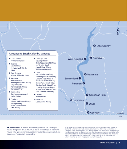 BE RESPONSIBLE: All that wine tasting can add up Ensure you have have a a a a a a a a a a a a a a a designated driver You must be 19 years of age or older and have have a a a a a a a a a a a a a valid government issued identification to consume alcoholic beverages Please drink responsibly †Call ahead to ensure the offer offer you’re interested in in in is is still available—many wineries are are family-run enterprises with with limited capacity and all all offers may be be modified or cancelled at at at at any time time without notice And remember that reservations are are sometimes mandatory as noted For discounts discounts on on on merchandise visitors must use a a a a a a a a a a a a a a a a a a a a a valid Canadian- issued Visa Visa Infinite Infinite or or or or or or Visa Visa Infinite Infinite Privilege card for for transactions Note that discounts discounts are applied before taxes and and can vary at at at the the the discretion of of the the the winery winery Please visit winery websites for for hours of of operation and and further details Lake Country 50th Parallel Estate Kelowna