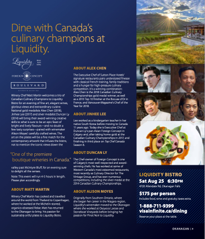 Dine with Canada’s culinary champions at Liquidity Winery Chef Matt Martin welcomes a a a trio of Canadian Culinary Champions to Liquidity Bistro for an an evening of fine art elegant wines glorious views and extraordinary cuisine National gold medalists Alex Chen (2018) Jinhee Lee (2017) and silver medalist Duncan Ly (2014) will bring their award-winning creative skills to to what is sure to to be an epic feast of bright and and lively flavours—and no doubt a a a a few tasty surprises—paired with winemaker Alison Moyes’ carefully crafted wines The art on the the plates will be a a a a fine match for the the contemporary artwork that infuses the bistro not to mention the the iconic views down the the “One of the premiere