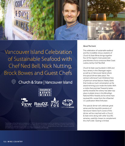 This celebration of sustainable seafood and the incredible vinous creations of Church & State Wines brings together four of the region’s most passionate practitioners of eco-conscious West Coast cuisine led by Chef Ned Bell Church & State was founded in 2004 and has a a a a a winery in in the Okanagan region as as well as as on Vancouver Island where