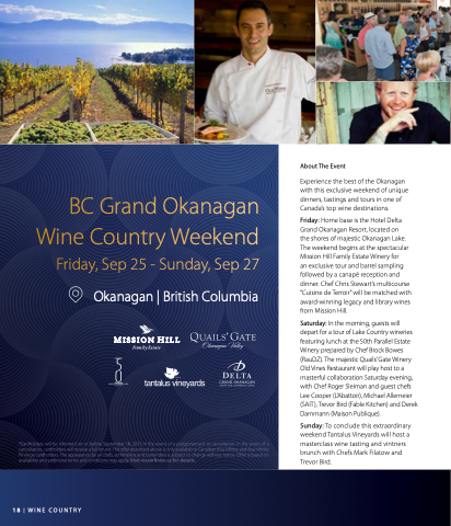 a a a tour of Lake Country wineries featuring lunch at at at the 50th Parallel Estate Winery prepared by Chef Brock Bowes (RauDZ) The majestic Quails’ Gate Winery Old Vines Restaurant will play host to a a a a masterful collaboration Saturday evening with Chef Roger Sleiman and guest chefs Lee Cooper (L’Abattoir) Michael Allemeier (SAIT) Trevor Bird (Fable Kitchen) and Derek Dammann (Maison Publique) Sunday: To conclude this extraordinary weekend Tantalus Vineyards will host a a a a masterclass wine tasting and vintners brunch with Chefs Mark Filatow and Trevor Bird *Cardholders will be be be informed on on on or or or or before September 18 2015 in in the the event event of of a a a a a postponement or or or or cancellation In the the event event of of a a a a a cancellation cardholders will receive a a a a a a a a a a a a a a full refund The offer described above is is is only available to Canadian Visa Visa Infinite Infinite and Visa Visa Infinite Infinite Privilege cardholders The appearance by all chefs sommeliers and bartenders is is subject to change without notice Offer is is based on availability and and additional terms and and conditions may apply Visit visainfinite ca for