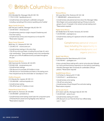 • Complimentary tasting of 5 wines • 25% discount on our our “Into the Vines” tour offered daily June 1 - Sept 7 22 | WINE COUNTRY