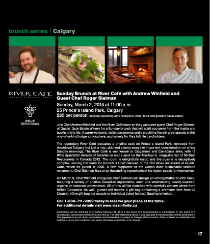 will design an an an an an unforgettable brunch menu featuring a a a a a a a a a a a a a a a a a a a a variety of of pristine Canadian ingredients each one emphasizing locally sourced organic or or seasonal provenance All of of this will will be matched with carefully chosen wines from from British Columbia As well guests will will receive a a a a a a a a a a a a a a gift gift bag bag containing a a a a a a a a a a a a a a premium item from from Le Creuset (One gift gift bag bag per couple or individual ticket holder ) Seating is is limited Call 1-888-711-9399 today to to reserve your place at the table For additional details visit www visainfinite ca Cardholders will will be be be informed on on on on on or or or or before February 24 2014 in in in the the event event of of of a a a a a a a a a a a a a a a a a a a postponement or or or or cancellation cancellation In In the the event event of of of a a a a a a a a a a a a a a a a a a a cancellation cancellation cardholders cardholders will will receive a a a a a a a a a a a a a a a a a a a a a a a a a a a a a a a full refund The The offer described above is is is is only available to to Canadian Visa Infinite cardholders cardholders The The appearance by all chefs sommeliers and and and bartenders is is is is is is subject to to change without notice Offer is is is is is is based on on on on on on availability and and and additional terms and and conditions may apply Visit www visainfinite ca for details 17