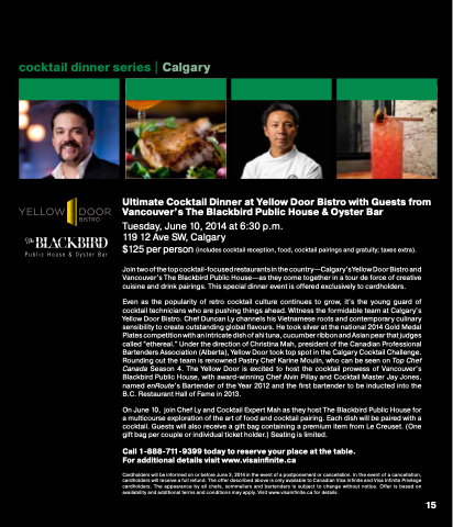 Cocktail Challenge Rounding out the the the team is is renowned Pastry Chef Chef Karine Moulin who can be be seen on on on Top Chef Chef Canada Season 4 The Yellow Door is is excited to host the the cocktail prowess of Vancouver’s Blackbird Public House with award-winning Chef Alvin Pillay and and Cocktail Master Jay Jones named enRoute’s Bartender of of the the the Year 2012 and and the the the first bartender to to be inducted into the the the B B C Restaurant Hall of of Fame in 2013 On June 10 join Chef Ly and and Cocktail Expert Mah as they host The Blackbird Public House for a a a a a a a a a a a a a a a a a a a a multicourse exploration of of the the art of of food and and cocktail cocktail pairing Each dish will will be paired with a a a a a a a a a a a a a a a a a a a a cocktail cocktail Guests will will also receive a a a a a a a a a a a a a a a a a a gift gift bag bag containing a a a a a a a a a a a a a a a a a a premium item from Le Creuset (One gift gift bag bag per couple or individual ticket holder ) Seating is limited Call 1-888-711-9399 today to to reserve your place at the table For additional details visit www visainfinite ca Cardholders will will be be be informed on on on on on or or or or before June 3 2014 in in in in the the event event of of of a a a a a a a a a a a a a a a a a a a postponement or or or or cancellation cancellation In In In the the event event of of of a a a a a a a a a a a a a a a a a a a cancellation cancellation cardholders cardholders will will receive a a a a a a a a a a a a a a a a a a a a a a a a a a a a full refund The The offer described above is is is is is only available to to Canadian Visa Visa Infinite Infinite and and Visa Visa Infinite Infinite Privilege cardholders cardholders The The appearance by all chefs sommeliers and and and and bartenders is is is is is is is subject to to change without notice Offer is is is is is is is based on on on on on availability and and and additional terms and and and conditions may apply Visit www visainfinite ca ca for details 15