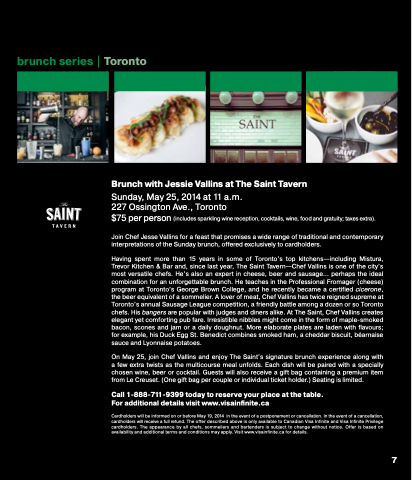 cardholders Having spent more than 15 years in in in in in in in some of of Toronto’s top kitchens—including Mistura Trevor Kitchen & Bar and and since last year year The Saint Tavern—Chef Vallins is is one of of the the city’s most versatile chefs He’s also an an an an expert in in in in in in cheese cheese beer and and sausage perhaps the the the ideal combination for for an an an an unforgettable brunch He He teaches in in in the the Professional Fromager (cheese) program at at at at Toronto’s George Brown College and he he he he he he recently became a a a a a a a a a a a a a a a a a certified cicerone the beer equivalent of of a a a a a a a a a a a a a a a a a a a a sommelier A lover of of meat Chef Vallins has twice reigned supreme at at at at Toronto’s annual Sausage League competition a a a a a a a a a a a a a a a a a a a a a a a friendly battle among a a a a a a a a a a a a a a a a a a a a a a a dozen or or or so so Toronto