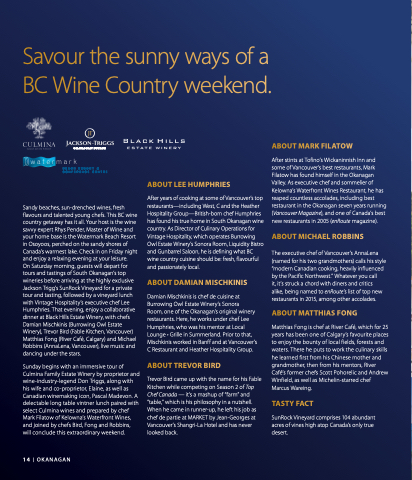 Savour the sunny ways of a a a BC Wine Country weekend Sandy beaches sun-drenched wines fresh flavours and talented young chefs This BC wine country getaway has it all Your host is the wine savvy expert Rhys Pender Master of Wine and your home base is the Watermark Beach Resort in Osoyoos perched on the sandy shores of Canada’s warmest lake Check in on Friday night and enjoy a a a a relaxing evening at your leisure On Saturday morning guests will depart for tours and tastings of South Okanagan’s top wineries before arriving at the highly exclusive Jackson Trigg’s SunRock Vineyard for a a a a private tour and tasting followed by a a a a vineyard lunch with Vintage Hospitality’s executive chef Lee Humphries That evening enjoy a a a a collaborative dinner at at Black Hills Estate Winery with chefs Damian Mischkinis (Burrowing Owl Estate Winery) Trevor Bird (Fable Kitchen Vancouver) Matthias Fong (River Café Calgary) and Michael Robbins (AnnaLena Vancouver) live music and dancing under the stars Sunday begins with an immersive tour of Culmina Family Estate Winery by proprietor and wine-industry-legend Don Triggs along with his wife and co-proprietor Elaine as as well as as Canadian winemaking icon Pascal Madevon A delectable long table table vintner lunch paired with select Culmina wines and prepared by chef Mark Filatow of Kelowna’s Waterfront Wines and and joined by chefs Bird Fong and and Robbins will conclude this extraordinary weekend ABOUT LEE HUMPHRIES