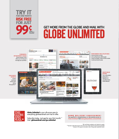 Globe Unlimited is your all-access pass to to everything globeandmail com has to to offer Subscribe today Just 99¢ for your first month ** Visit: globeandmail com/go-unlimited