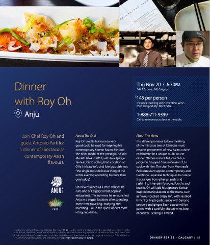 will add his signature Korean- inspired manipulations to the menu such as flavour-packed crispy tofu with sautéed kimchi or black garlic sauce with Serrano peppers and ginger Each course will be paired with a a a carefully chosen wine beer or cocktail Seating is limited D I I N N N N E E E R R R S S E E E R R R I I E E E S S • C A A L G A A R R R Y Cardholders will be be be informed on