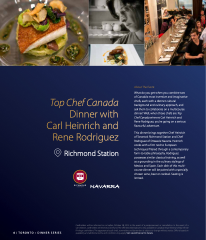 Cardholders will be be be informed on on on or or or or before October 28 2014 in in the the event event of of a a a a a postponement or or or or cancellation In the the event event of of a a a a a cancellation cardholders will receive a a a a a a a a a a a a a a full refund The offer described above is is is only available to Canadian Visa Visa Infinite Infinite and Visa Visa Infinite Infinite Privilege cardholders The appearance by all chefs sommeliers and bartenders is is subject to change without notice Offer is is based on T T T O O O R R R O O O N N N T T T O O O • D I I N N N N N N E E E R R R S S E E E R R R I I E E E S S availability and and and additional terms and and and conditions may apply Visit visainfinite ca ca for details