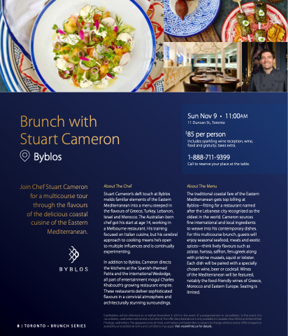 of the Mediterranean will be featured notably the food-friendly wines of Greece Morocco and Eastern Europe Seating is limited Byblos Join Chef Stuart Cameron
