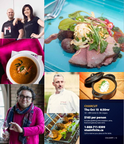 CHARCUT Thu Oct 15 6:30PM* 101—899 Centre St SW Calgary $165 per per person Includes sparkling wine wine reception wine wine food and gratuity taxes extra 1-888-711-9399 visainfinite ca Call to reserve your place at the table CALGARY | 13