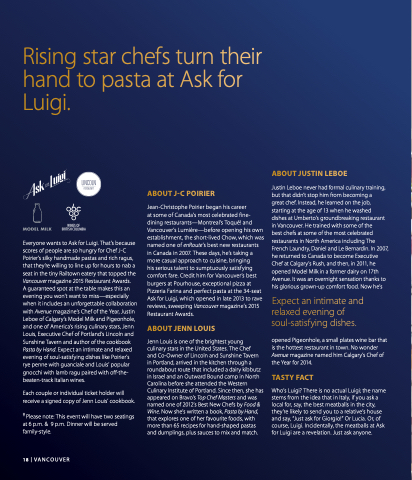 Rising star chefs turn their hand to pasta at Ask for Luigi Everyone wants to Ask for Luigi That’s because scores of people are so hungry for Chef J-C Poirier’s silky handmade pastas and and rich ragus that they’re willing to to line up for hours to to nab a a a seat in in the the tiny Railtown eatery that topped the the Vancouver magazine 2015 Restaurant Awards A guaranteed spot at the table makes this an an evening you won’t want to miss—especially when it includes an unforgettable collaboration with Avenue magazine’s Chef of the Year Justin Leboe of Calgary’s Model Milk and Pigeonhole and one of America’s rising culinary stars Jenn Louis Executive Chef of Portland’s Lincoln and and Sunshine Tavern and author of the cookbook Pasta by Hand Expect an an an intimate and and relaxed evening of soul-satisfying dishes like Poirier’s rye penne with guanciale and Louis’ popular gnocchi with with lamb ragu paired with with off-the- beaten-track Italian wines Each couple or individual ticket holder will receive a signed copy of Jenn Louis’ cookbook † Please note: This event will have two seatings at 6 p p m m & 9 p p m m Dinner will be served family-style ABOUT J-C POIRIER